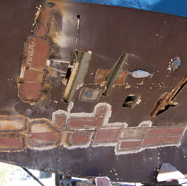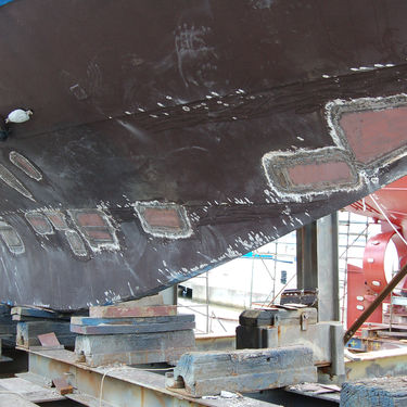 First haul out in Australia was in November 2007 at the domain slip in Hobart. Scaldis was sandblasted and got a new epoxy coating, plus another group of new patches where new holes were blown in the hull.